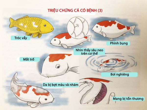 Dấu hiệu: Xuất hiện các đốm trắng nhỏ trên da, vây hoặc mang cá. Cá thường cọ mình vào thành hồ, bơi lờ đờ.